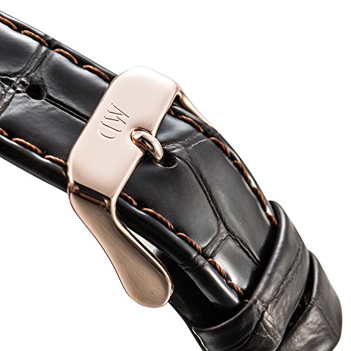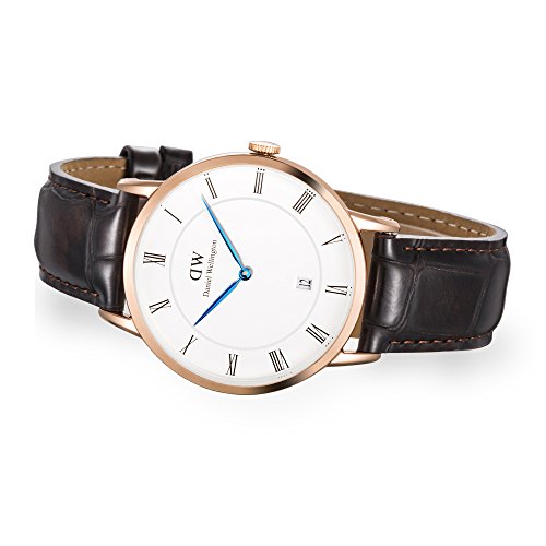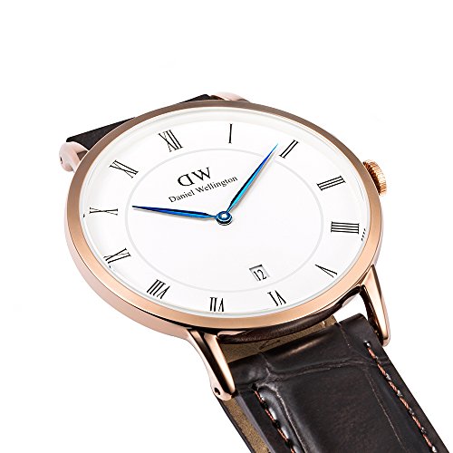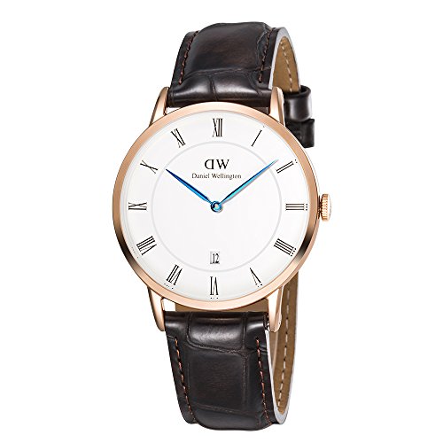 Rose gold-tone stainless steel case with a dark brown leather strap. Fixed rose gold-tone bezel. White dial with blue hands and Roman numeral hour markers. Dial Type: Analog. Date display above the 6 o'clock position. Quartz movement. Scratch resistant mineral crystal. Pull / push crown. Solid case back. Case diameter: 38 mm. Case thickness: 7 mm. Round case shape. Band width: 19 mm. Tang clasp. Water resistant at 30 meters / 100 feet. Functions: date, hour, minute,. Casual watch style. Daniel Wellington Dapper York White Dial Dark Brown Leather Unisex Watch 1102DW.Feature