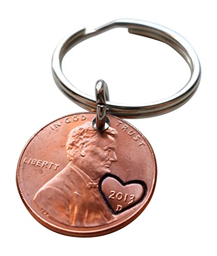 -. Title : 2013 Penny Keychain with Heart Around Year; Hand Stamped Couples Keychain