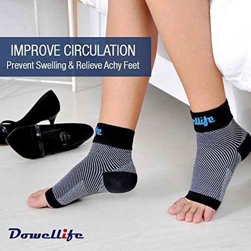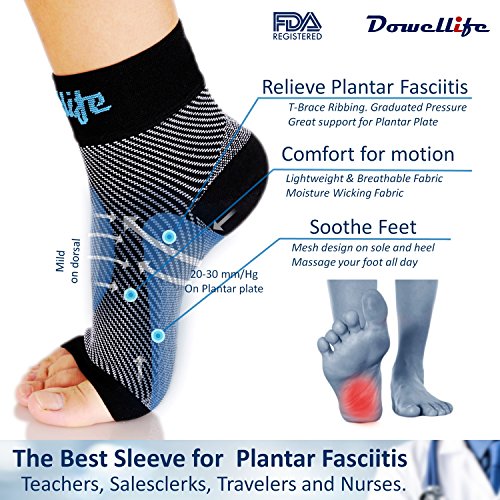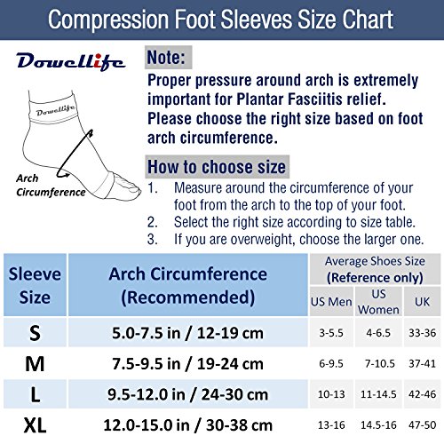 Dowellife Graduated Compression Foot Sleeve Do you suffer from Plantar Fasciitis, heel pain, foot swelling or poor circulation? If you do, you should join us, ?we have tried and benefited from using Dowellife Graduated Compression Foot Sleeve. Our compression foot sleeves provide a wonderful, stimulating energy to make your feet better every day. ?They were designed with our "T-Brace Foot Map Ribbing" technology to support the arch curvature that is ?similar to what an orthotic provides. For runner who put a lot of strain on their feet, the graduated compression sleeves are incredibly helpful as ?they provide extra pressure along the fascia ligament which relieves pain. They can soothe tire feet to fast?muscle recovery. For people who are on their feet, sit in one place all day, travel or work in office, our compression sleeves can ?also improve circulation to reduce swelling and inflammation. They will become a valuable piece of clothing?for you. Dowellife compression sleeves cannot damage a healthy body under any circumstances because they only ?provide a positive, performance-enhancing effect. However,for them to be effective it is important for you to take ?your measurements to determine the correct size for you. - The light compression zones are 10-15mmHg.?