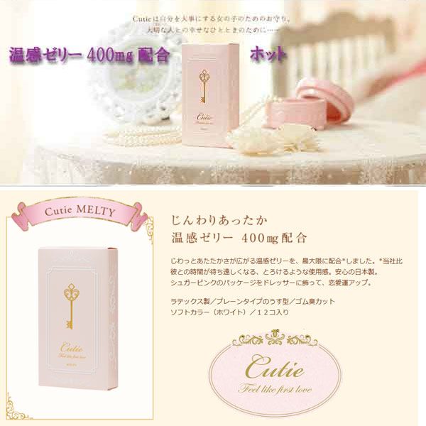新・女性の定番コンドーム「Cutie」 "もっていないときはしない”自分のカラダを、もっと大事にしてあげましょう。 自分をだいじにして、彼からもっと愛されたい・・・ そんな願いから「Cutie」は生まれました。 避妊や性病予防は、女性にとってとても大事なこと。 やさしいパステルカラー、角度によってチラチラと光るパール感、上品なゴールドの箔、アンティークのようなモチーフ… かわいいけれど、甘すぎない。 大人の女性がもつにふさわしいデザインです。 品名:キューティー(ピンク箱) 特徴:じんわりあったか温感ゼリー400mg配合、ラテックス製、プレーンタイプの薄型、ゴム臭カット 入数:12個 製造:不二ラテックス(日本製) メーカー希望小売価格:1080円 医療機器承認番号:219ABBZX00250000 ( こんどーむ スキン 避妊具 こんどむ コンドム ゴム 避妊 ナイトライフ )
