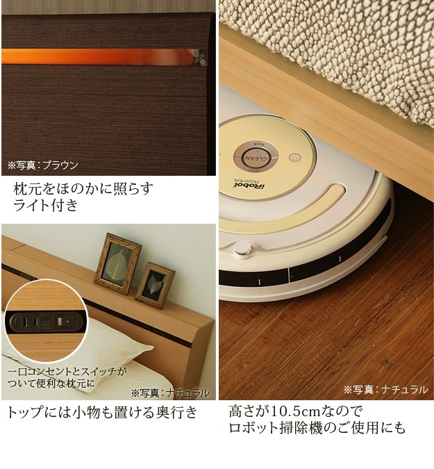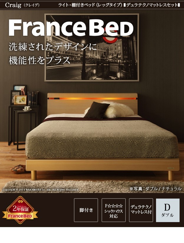 【!ご注文前に必ずご確認下さい!】●メーカー直送のため代金引換はお受けできません。●沖縄・一部離島は別途送料がかかります。お見積りいたしますのでお問い合わせ下さい。●商品サイズと設置場所、搬入経路のご確認をお願いいたします。●受注生産品のため、発注後のキャンセル及び変更はお受けできませんのでご了承ください。●安心のメーカー2年保証【セット構成】ベッドx1・マットレスx1【カラー】ブラウン・ナチュラル【仕様】■ベッド本体:天然木化粧合板(ウエンジ/タモ)・ファインセラミック塗装、プリント紙化粧合板床板:布張りコンセント:1口1500Wコード長さ:約1.8m照明:白熱灯1個10W(x2)◎組立品■マットレス張地:ポリエステル50%、ポリプロピレン50%中身:ウレタンフォーム、パームパッド、ポリエステル綿、防虫不織布、羊毛コイル:デュラテクノスプリング【サイズ】■ベッド外寸:幅145x奥行212x高さ72.5cm/重量:約46kg床面高さ:22.5cm床面サイズ:幅145x奥行196cm宮上有効奥行:11cmフレーム下高さ:10.5cm■マットレス外寸:幅140x奥行195x高さ23cm/重量:約26kg株式会社ナカムラ(I-4700526)