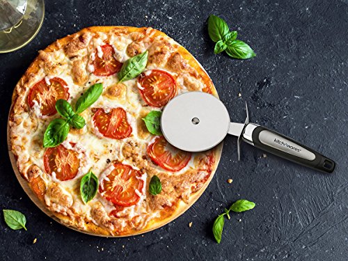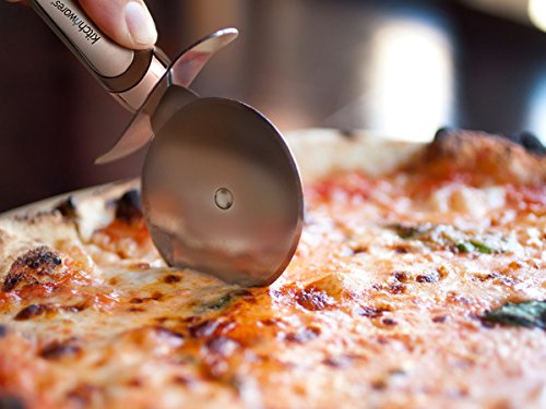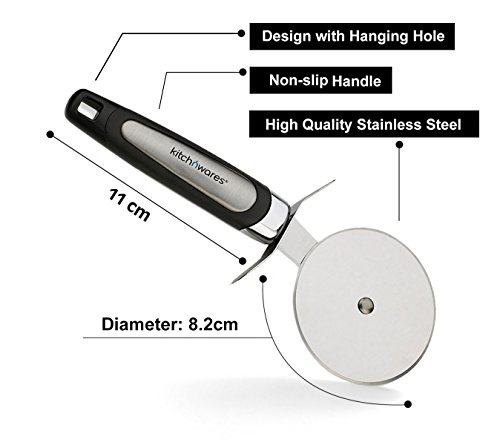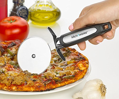 Studio : Kayco USA Publisher : Kayco USA Product Description 8 x 3 Ultra-Sharp Wheel Pizza Slicer with Thumb Guard for Pizza Crust, Belgian Waffles, Lasagna or Fudge Brownies - by Kitch N' Wares Kitch N' Wares' Pizza Slicer is sharper larger stainless steel blade. The large, soft handle absorbs pressure. Its handle is made to allow firm and comfortable, non-slip grip ease while slicing pizza or dough. It has a convenient hanging hole ensures space-saving storage. The die cast zinc built-in finger and thumb guard keeps them away from the blade for added safety. The ergonomic handle features stability and extra security. This pizza cutter is easy to clean and dishwasher safe. Cuts more than pizzas, it can be used on any food that you want to cut or slice! Spend your money for the good ones, Kitch N' Wares will get you satisfied, get yours today. Try it, it's totally risk free! If for any reason you decided you don't like it, just send a simple email and get a full refund! Absolutely no questions asked, so you have nothing to lose, click add to cart now! 0