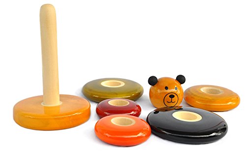Wooden multicolored stacking toy with five brightly colored rings. Beautifully crafted and polished, this classic developmental toy will be perfect to engage your kid's curiosity.