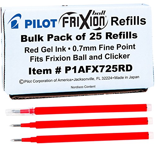 -. Feature : Bulk Pack of 25, 0.7mm Fine Red Gel Ink Pilot Frixion Refills. / Refills fit Pilot FriXion Ball and Clicker erasable Gel Ink Pens. / FriXion ball pens have a unique Thermo-Sensitive Gel Ink Formula that disappears with erasing friction. / Rewritable-erase and rewrite repeatedly without damaging documents - No wear or tear! Fine point 0.7mm. Writes smooth, erases clean.