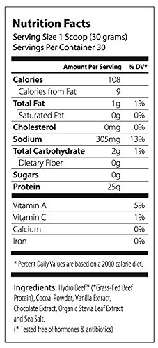 Ingredients: Hydro Beef™ (Grass-Fed Beef Protein), Cocoa Powder, Vanilla Extract, Chocolate Extract, Organic Stevia Leaf Extract, Sea Salt. (From Pastured Cows That Are Tested Free From Hormones & Antibiotics)