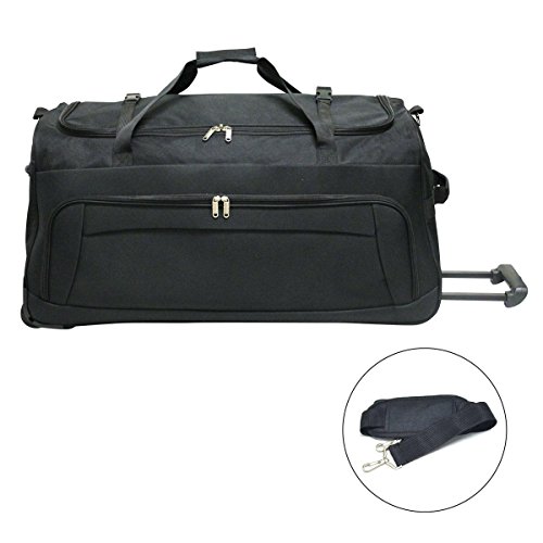 Product Description This rolling duffel features a sturdy pull-up handle and dual in-line skate wheels. Dual heavy duty bottom rails help support the weight and protect the bottom while lying flat. The spacious main compartment is large enough to accommodate all your travel gear or samples. On the side there is a large zipper pocket that allows you to store other materials. The bag is finished with buckle straps to secure the bag during transit and a padded detachable shoulder strap. 0
