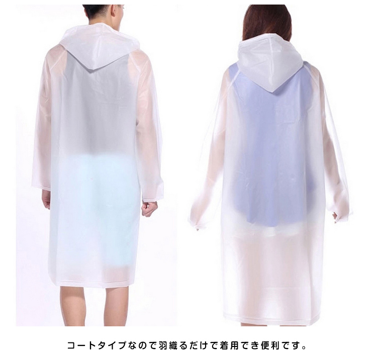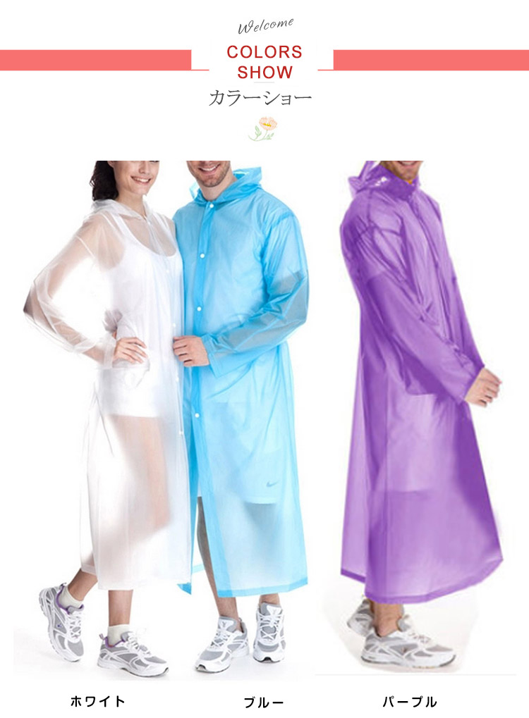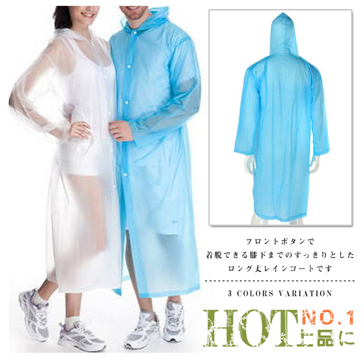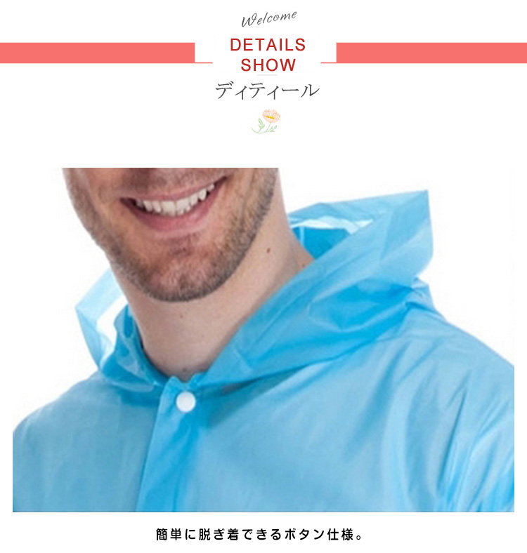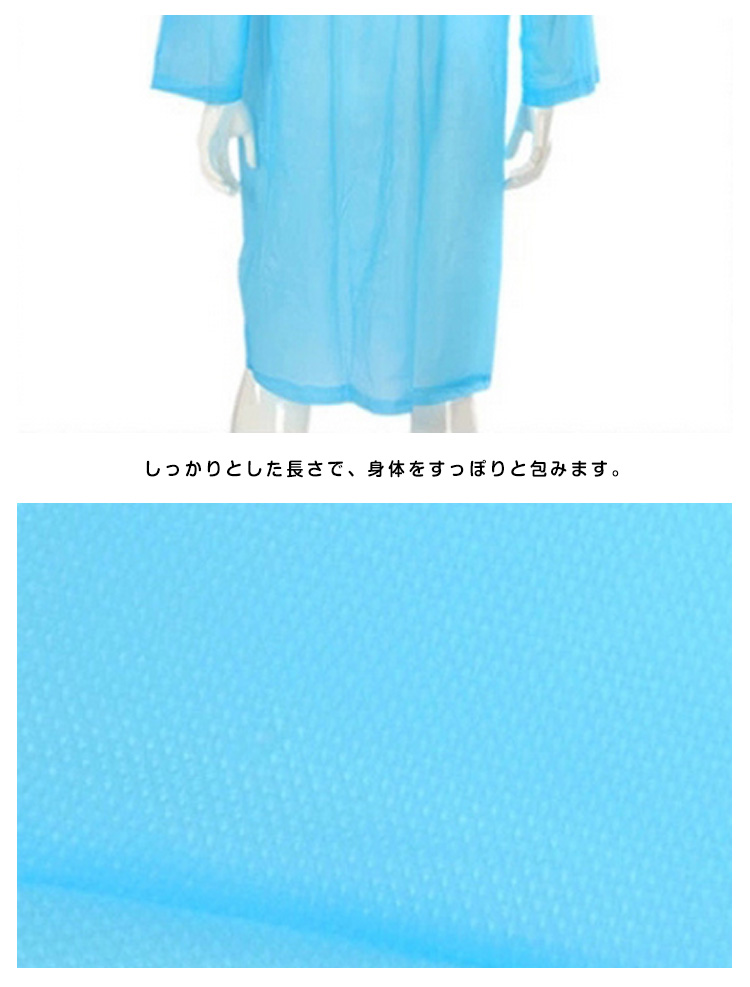 | フロントボタンで着脱できる膝下までのすっきりとしたロング丈レインコートです。膝下までストンとした長め丈の綺麗なラインが特徴。コートタイプなので羽織るだけで着用でき便利です。 | |