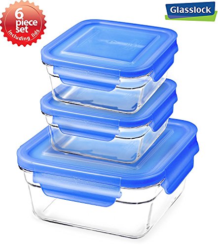 Snaplock Lid Tempered Glasslock Storage Square Containers 6pc set Combo with Blue Lid - Microwave & Oven Safe Spill Proof