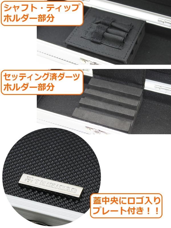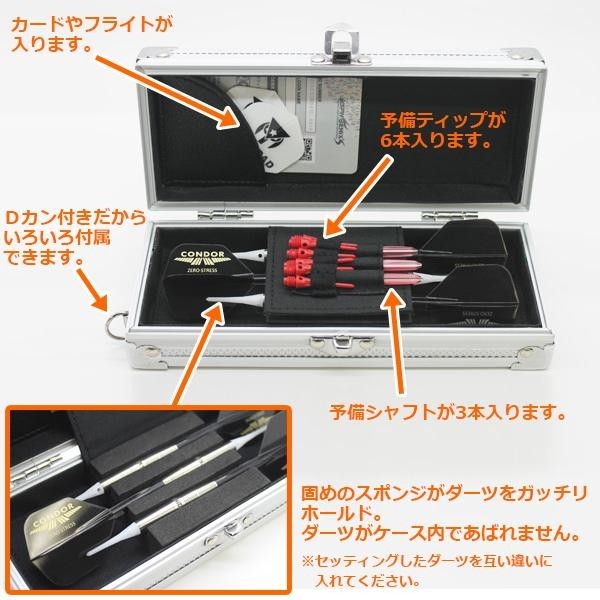 アルミケースは立体式フライト(CONDOR・フライトL・Fit)を装着したままでも収納可能です。側面にはD型金具がついているので、フライトケースやティップケースなどつけることができます。ケース中の、固めのスポンジがダーツをがっちりホールド。ダーツがケース内で暴れません。長めのセッティングバレルが入るよう、横幅も長くなっています。 |