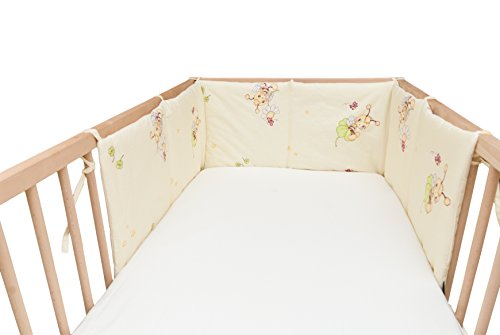 This half bumper pad is suitable for 47' x 24' or 52.5' x 27.5' baby bed. It is designed to protect your baby hurting his or her head against the cot or crib and leave the other half open for exploring the surroundings. The bumper can be securely attached to the cot with eight stripes.