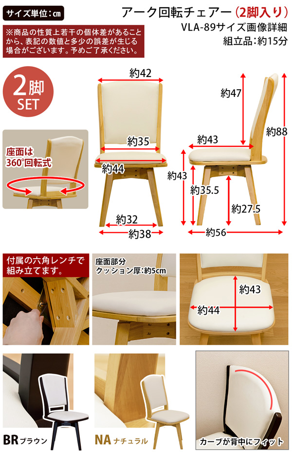 本商品はお取り寄せ商品のため、稀にご注文入れ違い等により欠品・遅延となる場合がございます。誠に恐れ入りますが、何卒ご了承ください。 また、以下の場合には追加送料がかかる場合がございます。  ・大型商品の複数購入時 ・同梱区分が異なる商品の複数購入時  【出荷目安】:1 - 4営業日 ※土日・祝除く 【同梱区分】:TS 1490 【梱包サイズ】:大型商品 【代引き決済】:不可  配送伝票の依頼主は出荷元(メーカーもしくは仕入元)名となる場合がございますので、お受け取りの際はご注意ください。   【型番】VLA89  【商品名の色やサイズについて】 こちらは「ダイニングチェア/回転チェア(アーク) 【2脚セット】 合成皮革/木製 ナチュラル」の商品ページです。商品画像や商品情報には、色違いやサイズ違いの商品が載っている場合がございます。ご注文前に色・サイズ・セット内容のご確認をお願いいたします。  多彩な組み合わせが出来るので、ライフスタイルに合わせてお選び下さい  チェアは回転式になりますので、立ち座りが楽に出来ます 360度クルクル回転します! クッション厚は、5cmもありお尻が痛くなりません!(個人差有) PVC素材なので拭き取りも簡単です 背もたれカーブが背中にフィットして長時間座っていても疲れにくいです  カラーも、各ブラウンとナチュラルがございます  幅440x奥行560x高さ880mm(梱包サイズ:幅670×奥行460×高さ560mm) 座面高:430mm 座面厚:50mm 本体重量:8.2kg(梱包重量:18.9kg) 組立式(約15分/付属の六角レンチにて組立)1梱包 ラバーウッド(天然木) ラッカー塗装 チェア座面・背もたれ:PVC  【ご注意事項】 ※本商品は、北海道・沖縄・離島への配送はいたしかねます。あらかじめご了承ください。