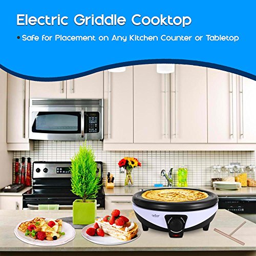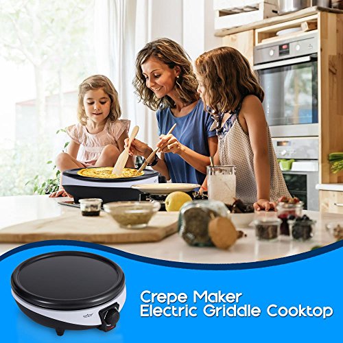 NutriChef's Crepe Maker provides you with quick & convenient food prep ability. The compact tabletop design is easy to use, allowing you to create delicious desserts like crepes and blintzes -- or use it to whip-up a bacon, egg & pancake breakfast! The non-stick aluminum cooking surface features a wide 11 plus inch diameter cooking surface with a temperature adjustable rotary control knob. Enjoy hassle-free hot plate food preparation with the NutriChef Electric Griddle & Crepe Maker. Features: Simple Crepe & Blintz Cooking Compact, Quick & Convenient Cooktop Temperature Adjustable Rotary Dial High-Powered Heating Element Hassle-Free Operation & Plug-in Design Includes (2) Non-Stick Removable Griddle Plates Stainless Steel & Stain-Resistant Construction Safe for Placement on Any Kitchen Counter or Tabletop What’s in the Box: Electric Crepe Griddle Removable Grill Plate Removable Mini-Pancake Plate Wooden Spreader & Spatula Utensils Technical Specs: High-Powered Heating Element: 1000 Watt Cooktop Diameter: 11.8’’ Adjustable Temperature Controls: 212 - 482 °F Power Cord Length: 3.3' ft. Power: 120V Dimensions: 11.8’’ x 12.8’’ x 3.9’’ Sold as: 1 Weight: 7.18 lbs.Feature