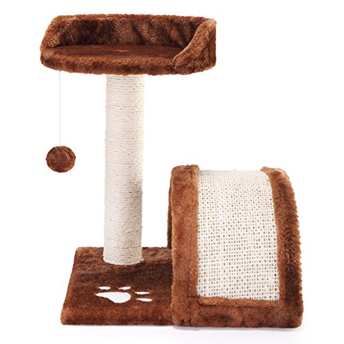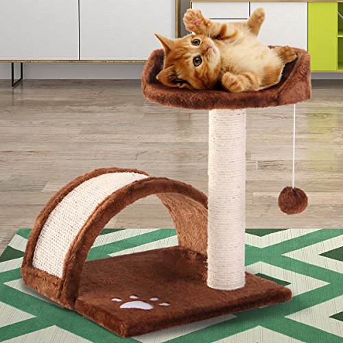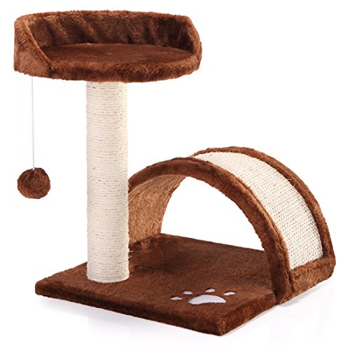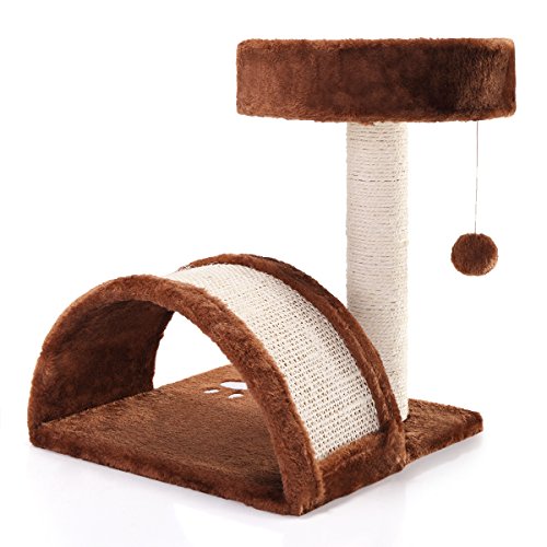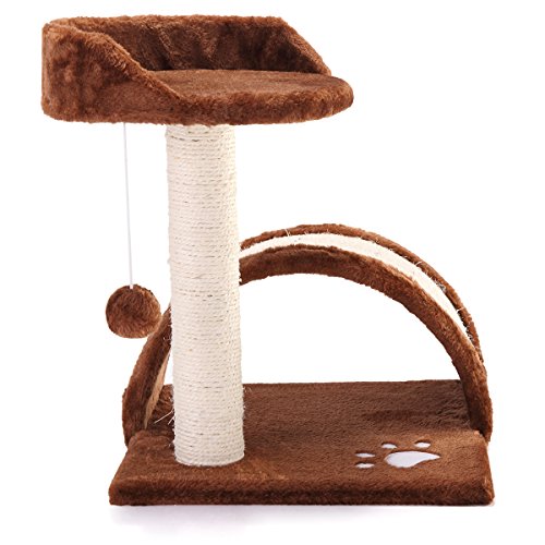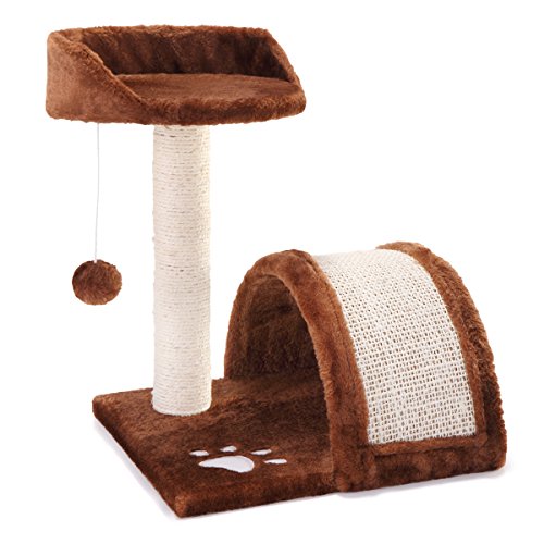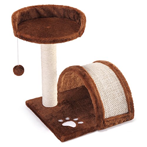 Comfortable fabrics, exquisite design, this cat tree is a magic castle, park and cozy nest for your beloved cat. It is specially suitable for kittens. Made of E1 grade particleboard which is carefully selected. The sisal rope which is covering the cat post, not only can prevent the cat condo shaking, but also can be used for the cat scratch so that your fabric sofa, wooden furniture and shoes can escape from being scratched. Specification: Color: Brown Max weight: 25 LBS Cleans easily with a vacuum and damp cloth Perch dimensions 12" Diameter Tunnel height: 7.5" Overall Dimension: 14"(L) x 14"(W) x 19"(H). Package Includes: 1 x Cat tree 0