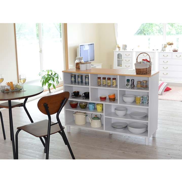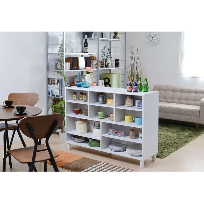 ●リビング側には、浅めの収納で本や、小物、雑誌を収納、キッチン側には、深めの収納で、食器やキッチン用品を収納。