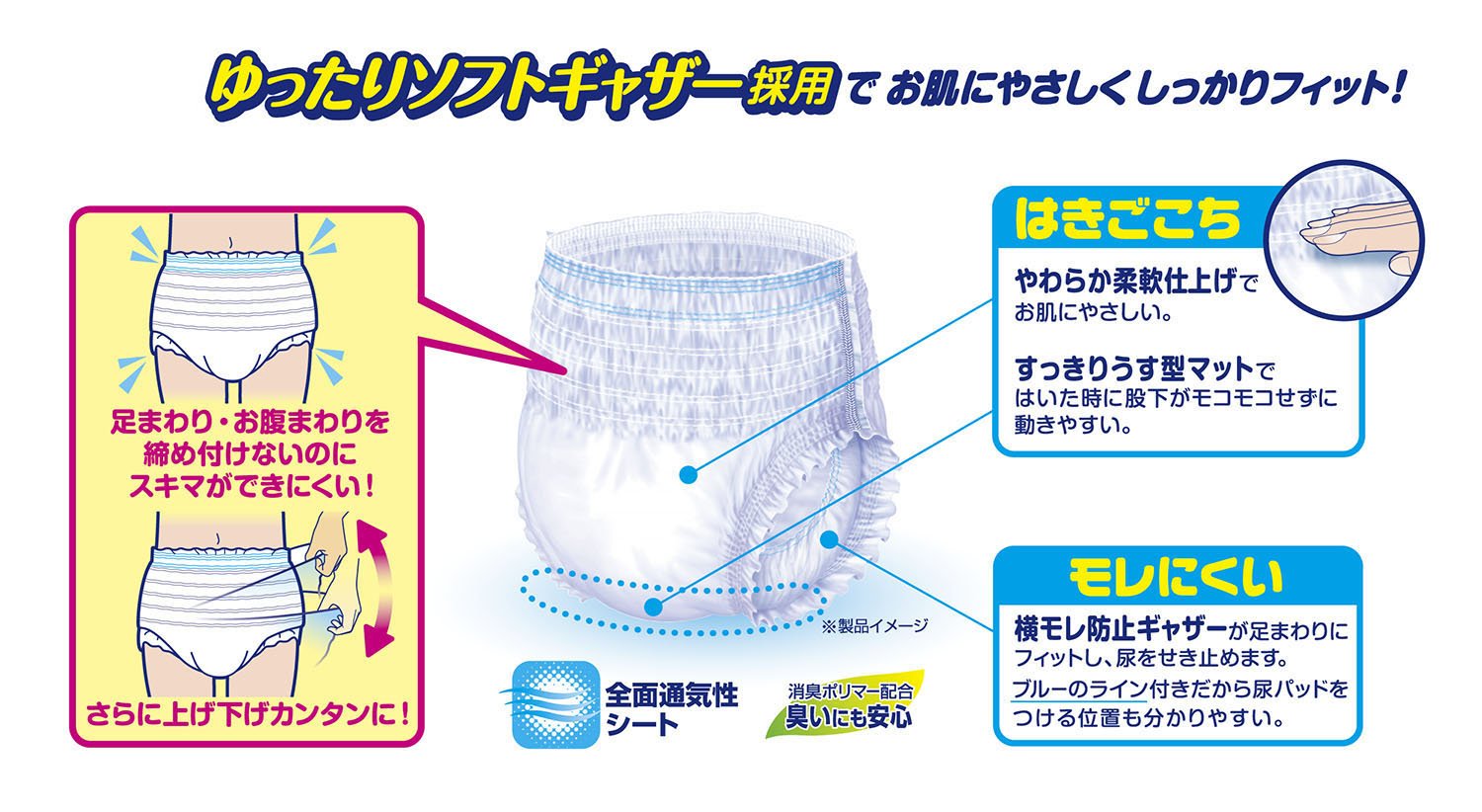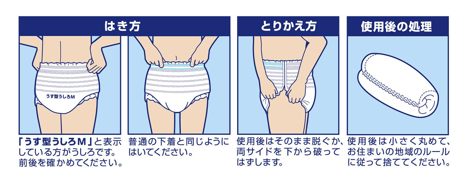 ● Easy to wear ● Easy to move ● Relaxing soft gather ● Cleansing mat type ● Comfortable to the skin ● Overall breathable sheet ● Fluffy soft material ● Difficult for leakage ● Gore peeling off laterally ● About two pee ● Deodorant polymer blend