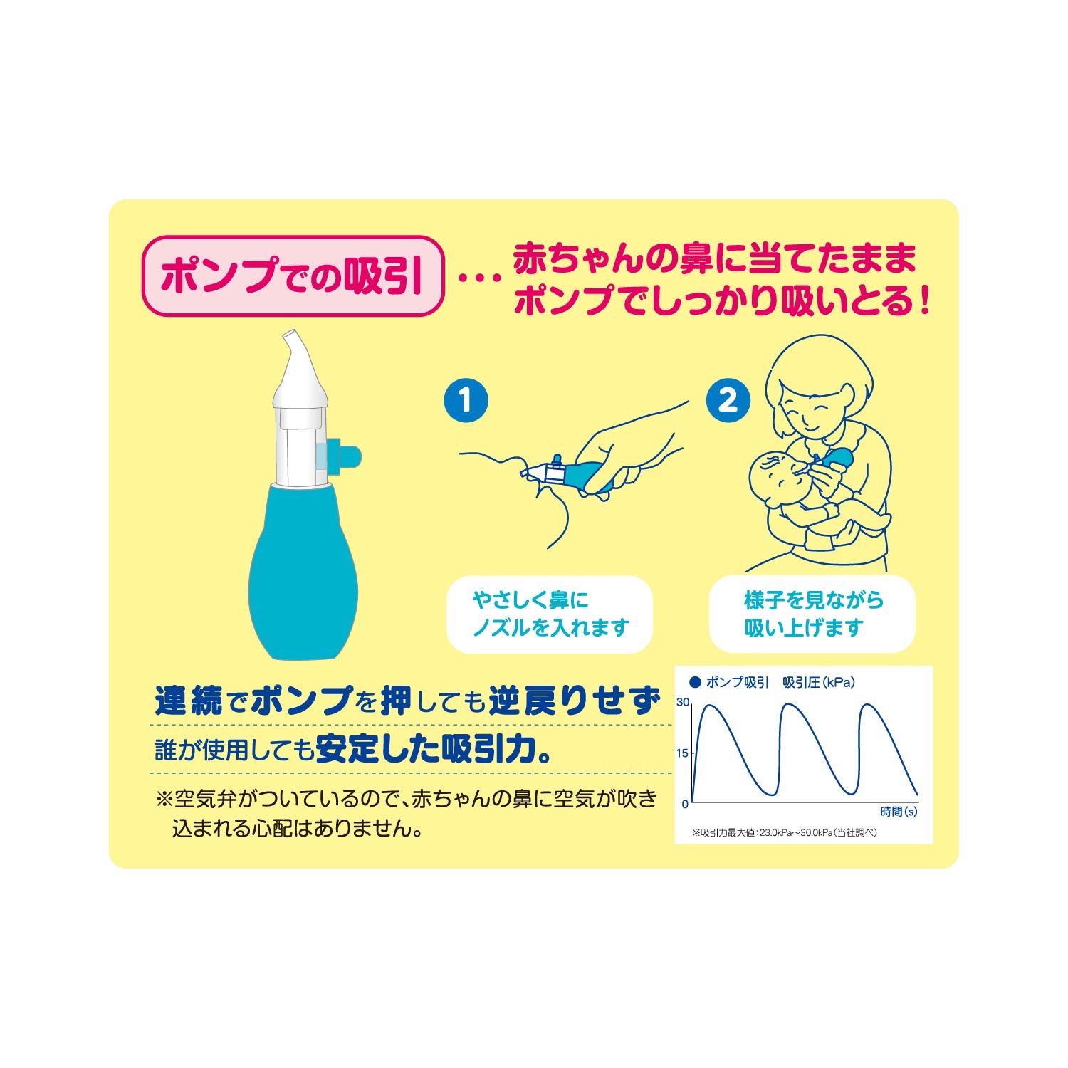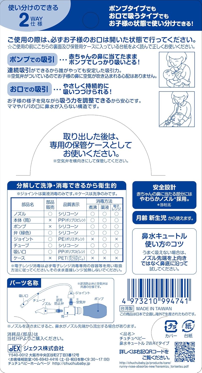 「ポンプで吸引」と「口で吸引」の2通りの使い方ができる鼻水吸引器!