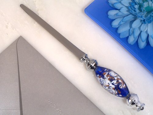 - This unique design handmade Venetian like glass letter opener has a handle with a dazzling blue and white swirl design glass bead accented with a hint of gold