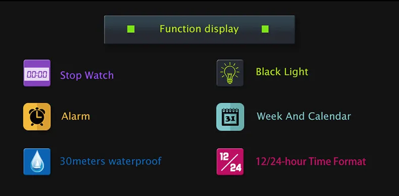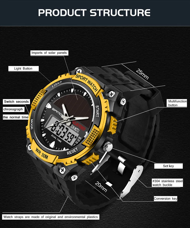 Feature:Back Light,Shock Resistant,Chronograph,Complete Calendar,Diver,Alarm,Water Resistant,Multiple Time Zone,Luminous,Auto Date,Stop Watch,LED display,Swim,Solar