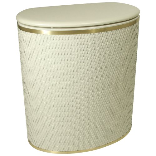 -. Feature : Oval shaped wicker hamper with matching vinyl lid / Brushed metalized trim around top and bottom / Quality materials and construction, made in USA / Made in USA