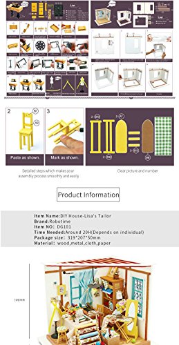 -. EAN : 0729253615259 -. Feature : Our products are specially designed to be safe and suitable for little hands of kids to provide them absolutely greater fun / Dollhouse cloth designing room featured with all perfect suitable essentials related, for kids to get skills of crafting and clothing interest / Features an easy to build kids wooden house with two wall windows, and open front for kids play and encourages imaginative role play in children / Decorate your drawing room with this central piece of wooden house, and provide your child a perfect tech and creative fun / Suitable for all ages (6 & up or adult) by one party or in groups a great way to spend quality time with the family and loved ones -. IsAdultProduct : 0 -. Label : Robotime -. Manufacturer : Robotime -. MPN : DG101 -. PackageQuantity : 1 -. PartNumber : DG101 -. ProductGroup : Toy -. ProductTypeName : PUZZLES -. Publisher : Robotime -. Studio : Robotime -. Title : 3D Puzzle Robotime DIY Miniature Dollhouse Kit DG101-Lisa's Tailor Best gift for adult and Kids -. UPC : 729253615259