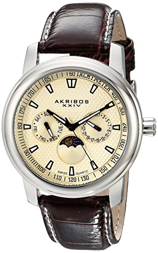 -. Title : Akribos XXIV Men's AK573BR Ultimate Swiss Quartz Multifunction Champagne Dial Stainless Steel Brown Leather Strap Watch