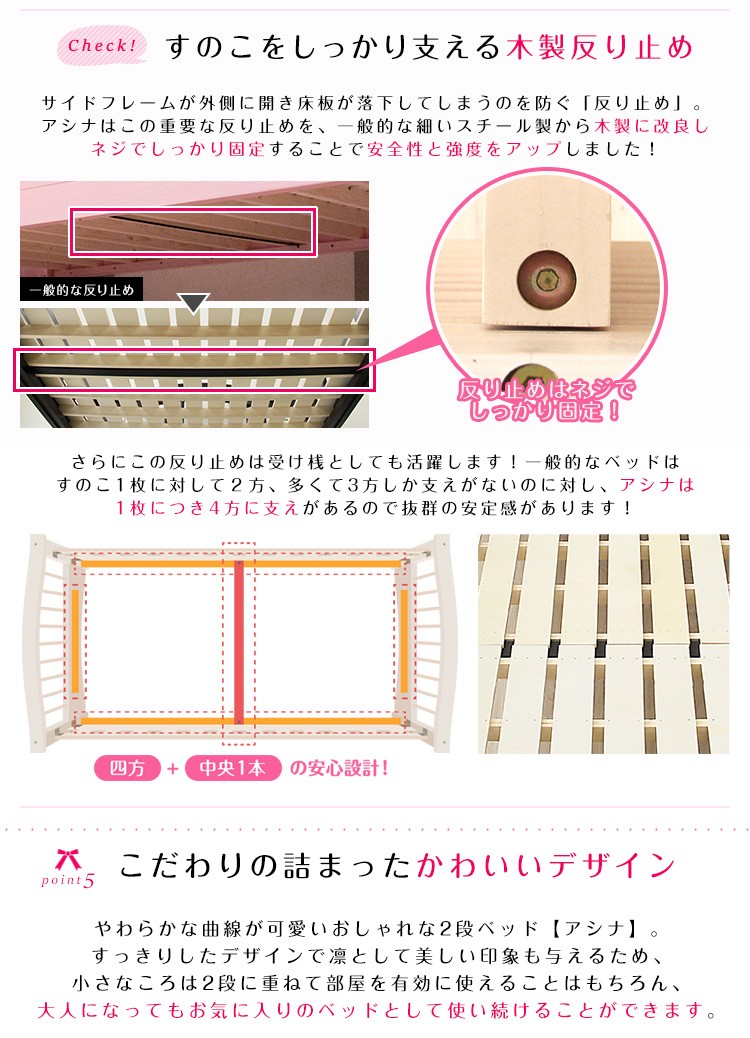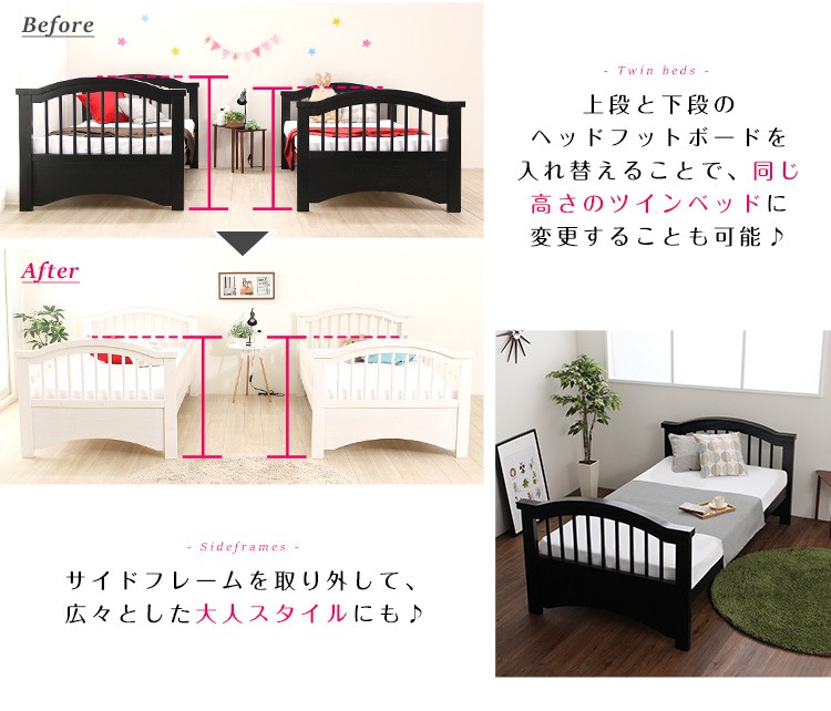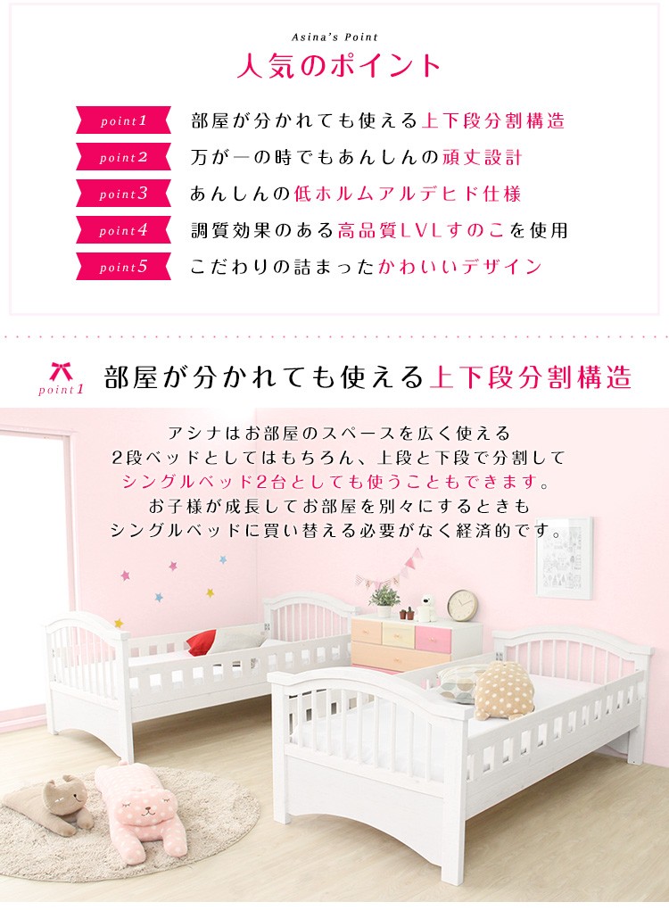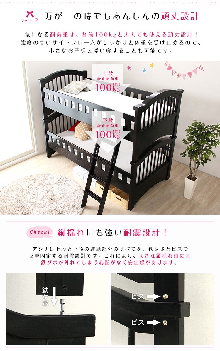【商品について】2段ベッド【Asina-アシナ-】(2段ベッド すのこ セパレート可)■サイズ:外寸:(約)幅205x奥行109x高さ160cm※商品重量:(約)78.5kg■カラー:ホワイトウォッシュ ダークブラウン■素材:本体:天然木(パイン材) / すのこ:天然木化粧合板(LVL)表面材:ラッカー塗装■その他:・お客様組立商品です・梱包サイズ:(1-5)(約)115x82x14cm(2-5)(約)115x96x14cm(3-5)(約)202x47x11cm(4-5)(約)101x100x13cm(5-5)(約)133x35x10cm・梱包重量:(約)87.7kg