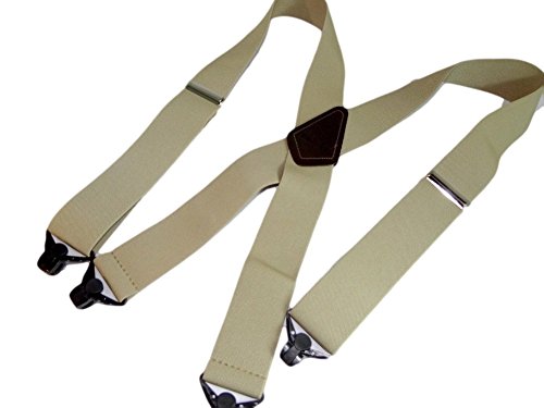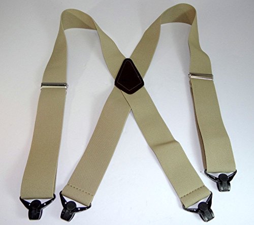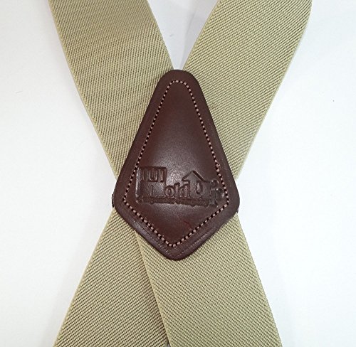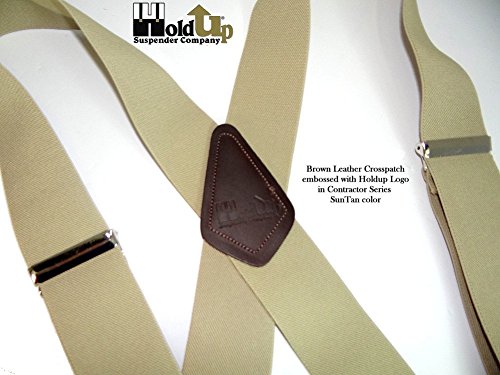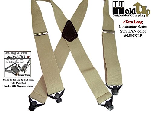 Binding : Apparel Product Description These 54" Extra Long dark Sun Tan beige colored 2" wide Jumbo XL Contractor Series suspenders are specifically designed for securely holding up a bigger man's pants throughout years of wear. With everything imaginable hanging from your trousers it's hard to keep them up with just a ordinary belt. The contractor Series Holdup suspender is specially designed with wider straps and our Patented jumbo Gripper Clasps assure your pants are Always Up with maximum comfort. These make perfect gifts for that hard working Big Tall man, who knows the limitations of conventional suspenders. This style has 4 Composite plastic Patented Grippers clasps for extra holding power. The patented plastic gripper clasps are cam activated which means the harder you pull on them the tighter they grip All materials are carefully chosen for elastic durability, good looks and are guaranteed to never slip, slide, or fly off. Buy one of these tasteful light Sun Tan color Contractor Series suspenders with black Plastic Gripper Clasps clips now. Hold-up® Suspender Company sells more suspenders in over 250 styles then any other USA manufacturer. These have a Unique Patented Hold-up® JUMBO black composite Plastic Grippers Clasp" with top grade natural leather X-back style crosspatch. These are part of the 2x4 Contractor series Hold-up® wide work suspenders in several colors that have 4 US Patented Jumbo GRIPPER CLASPS that hold tighter the harder you pull on them. Great for wearing with work jeans and our Hold-up® logo is etched into the Top Quality leather double strength crosspatch. Great for those seeking the best in a rugged working man's suspender. Works great for extra large men,construction workers, Bikers and hikers love wearing these too! 0