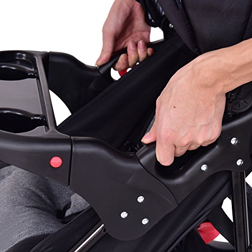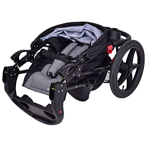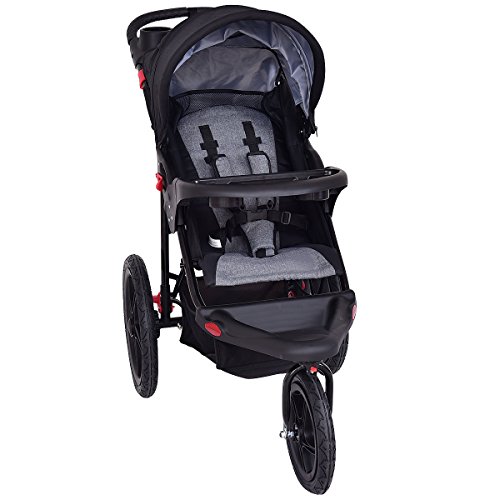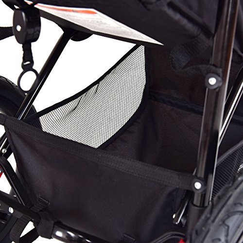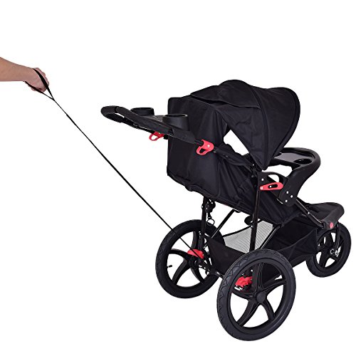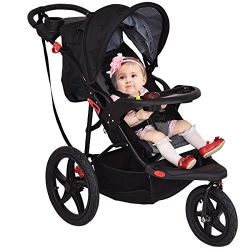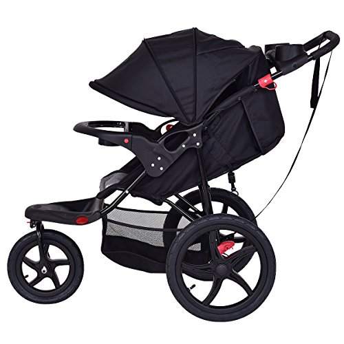 Description This lightweight jogger stroller is an ideal all-terrain stroller for your baby! Lightweight-yet sturdy-design makes it a perfect stroller for any on-the-go mom. The deluxe parents tray features a smartphone cradle. Moms love the extra-large storage basket (perfect to store a diaper bag, snacks and other baby gear) and the parents' tray with storage and two deep cup holders. Air-filled rubber tires offer suspension for a smooth ride on just about any terrain. Just lock the front wheel for added stability while jogging or unlock it for maneuverability on quiet, daily strolls. And a free tractive webbing provides second protection. Deluxe, padded stroller seat ensures that your child-from baby to toddler-will ride comfortably. The extra-large canopy allows your child to ride in the shade, protected from bright sunlight. Specification Color: Black Material: Steel frame, rubber wheels Weight Capacity: 33lb Weight Capacity of basket: 5lb Unit Weight: 22 lbs Overall dimension: 40.5"L x 22"W x 42"H Folded dimension: 21" x 22" x 33" Wheel Size: 12" front 16" rear Package Includes: 1 x Baby Stroller, 1 x Instruction 0 |