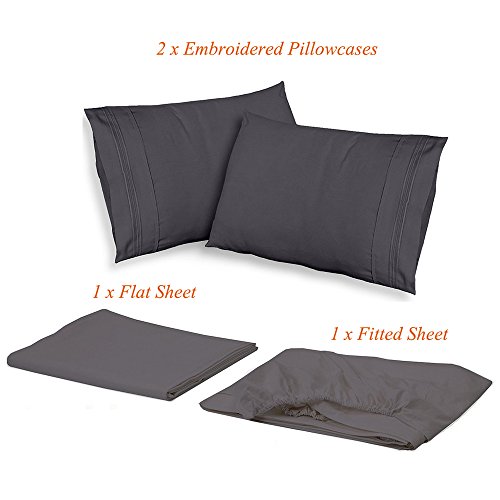 L-Angel 4pc 1800 Thread Count Brushed Microfiber Embroidered Bed Sheet Set with Fitted & Flat Sheet & Pillowcases - Deep Pocket Wrinkle Free Hypoallergenic Bedding, Gray, Queen