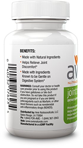 -. Binding : Health and Beauty -. Brand : Avie Nutraceuticals -. EAN : 0040232176234 -. Feature : Contains 300mg Water Soluble Turmeric Curcumin, 100mg Boswellia Serrata Gum Powder and 7mg Magnesium Sulfate* / Promotes smooth and free joint function* / Helps reduce swelling* / Promotes flexibility* / Made with ingredients known to be gentle on digestive system* -. IsAdultProduct : 0 -. Label : Avie Nutraceuticals -. LegalDisclaimer : *These statements have not been evaluated by the Food and Drug Administration. This product is not intended to diagnose, treat, cure or prevent any disease. -. Manufacturer : Avie Nutraceuticals -. MPN : 1736230 -. PackageQuantity : 1 -. PartNumber : 1736230 -. ProductGroup : Health and Beauty -. ProductTypeName : HEALTH_PERSONAL_CARE -. Publisher : Avie Nutraceuticals -. Size : 60 CAP -. Studio : Avie Nutraceuticals -. Title : Avie Joint Balance - Water-Soluble Curcumin - Boswellia - Formulated for Maximum Absorption and Bioactivity - NO PIPERINE! -. UPC : 040232176234