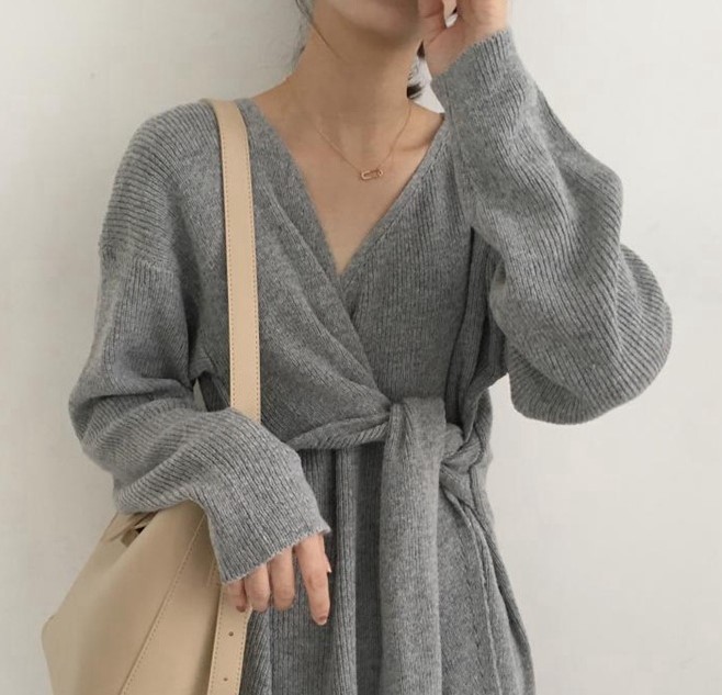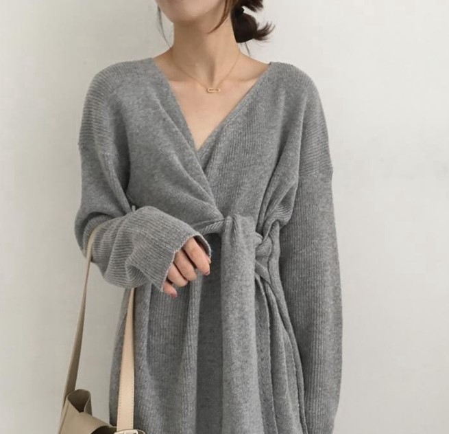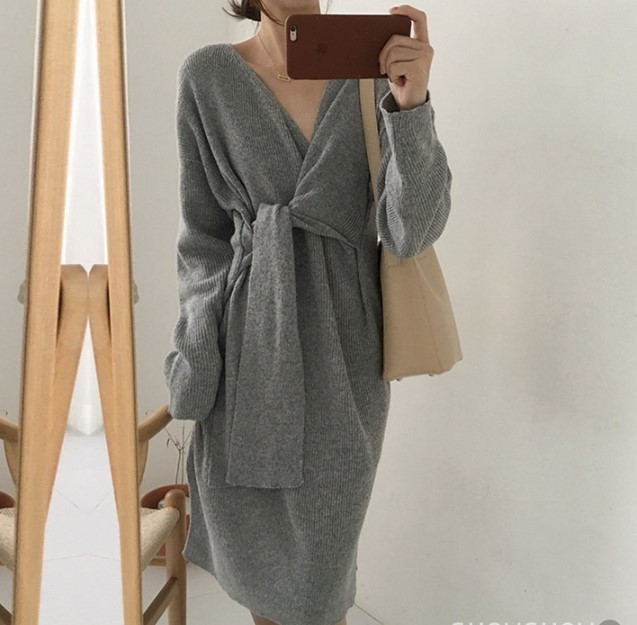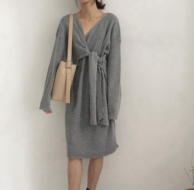 結びリボンで縦長を意識させられるひざ丈ワンピース。