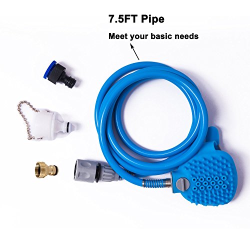 Our wearable combination sprayer-scrubber that could put the control of water in the palm of your hand. The soft brush is not only clean your fur baby, also give they a comfortable massage. If you wanna keep your fur baby stay in right place properly in tub, maybe you could also get the Restraint B001RMMWHY. FASTER BATHING The pet grooming tool combine bath brush and water sprayer, is perfect for hard-to-reach or sensitive areas, make it easy to wash your lovely pet; MASSAGE The Brush is Silicon, every touch like gently massage, reduce the stress of anxious pets during bathing; SAVE WATER Easy to adjust Variable Flow Lever toggles from OFF to Light to Full Flow, saving water and preventing accidental sprays; EASY to HANDLE One-size-fits-all strap attaches securely to your hand, both adult and child could enjoy the pet grooming; EASY to INSTALL and REMOVE This handheld pet grooming tool come with 7.5ft long pipe and 2 hose adapters to fit 0.6 inches standard faucet, quickly connects to garden, house or shower. DURABLE Our products' material is high quality. In addition,there is coil spring in the connection of pipe and brush, which protect the bathing tool properly.