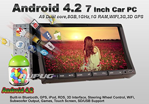 -. Feature : Fresh Android 4.2 Operating System:High running speed with Dual Core CPU,you can download APP from Android market or installed in SD card in advance,and you can keep connected through MSN, Skype, Gmail, Twitter, Facebook, QQ, blogs etc,handle official issues urgently while parking.Bulit- in Bluetooth with Microphone:you can enjoy streaming music and make hands-free phone calling while enjoy driving. / GPS Navigation Car Stereo:Bulit-in 3D GPS map for North America/Europe/Australia etc.support Google map online and you can update your map online.This GPS system will guide you to your destination accurately with voice broadcast.Dual Zone Function,you can make phone call with Bluetooth built-in microphone and play video or music while GPS navigation running. / Internet Function,Wifi internet supported,you can surf internet in high speed with Wifi internet .WiFi Support,,3G Support WCDMA ,3G dongle or via phone as WiFi hot spot (3G dongle need additional payment).Steering wheel control function:you can operating you car stereo with your steering wheel safely without touching car radio audio. / Capacitive Touchscreen car DVD player,100% Capacitive touchscreen with 7color key background,3D rotating LCD Monitor touchscreen smooth sliding with no blind angle.Multi-touch TFT touchscreen for Android game and causal wallpaper change.AM/FM Radio player,Radio Response Bandwidth frequency,AM: 522 KHz-1620 KHz;FM: 87.5 MHz-108 MHz.Country:China,Europe,Eastern,Russia,USA1,USA2,Japan etc. / Multi Function car kit,Touch Screen, 3G Wifi internet,Steering Wheel Control, GPS navigation,RDS, DVR,SD/USB Support, Remote control,FM Transmitter, Subwoofer Output, 3D Interface, iPod, Built-in Bluetooth,car logo setting.Rear Camera Function,you can observe everything behind your car for reversing safely with night vision and waterproof backup camera