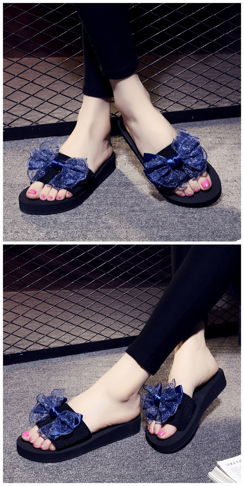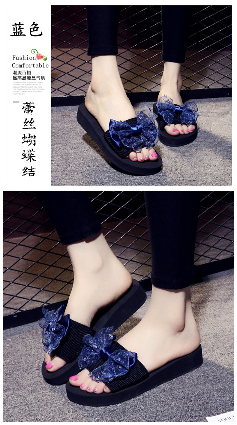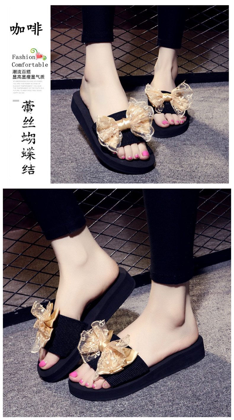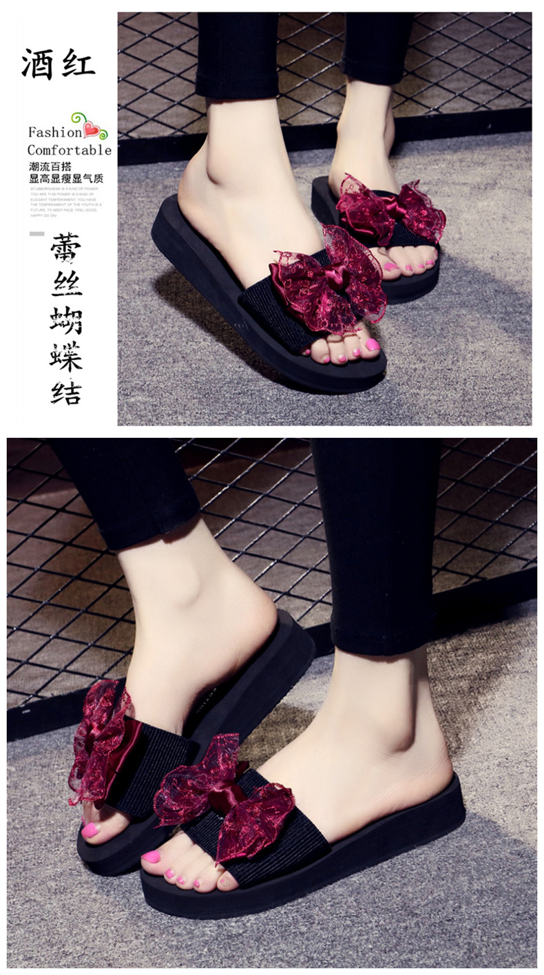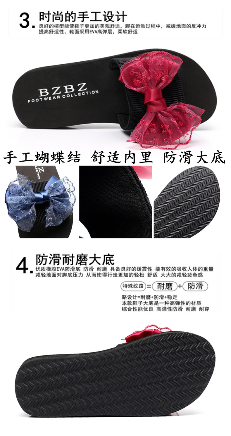 韩版百搭外穿厚底凉拖鞋女夏时尚手工蝴蝶结平底一字拖防滑沙滩鞋