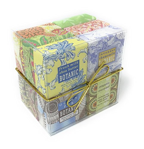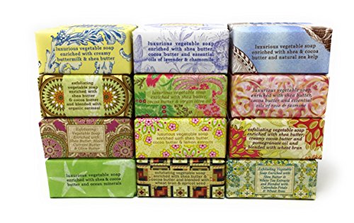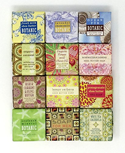 - 12 French-milled, luxurious vegetable soaps shea butter, essential oils & natural extracts in captivating botanical scents.