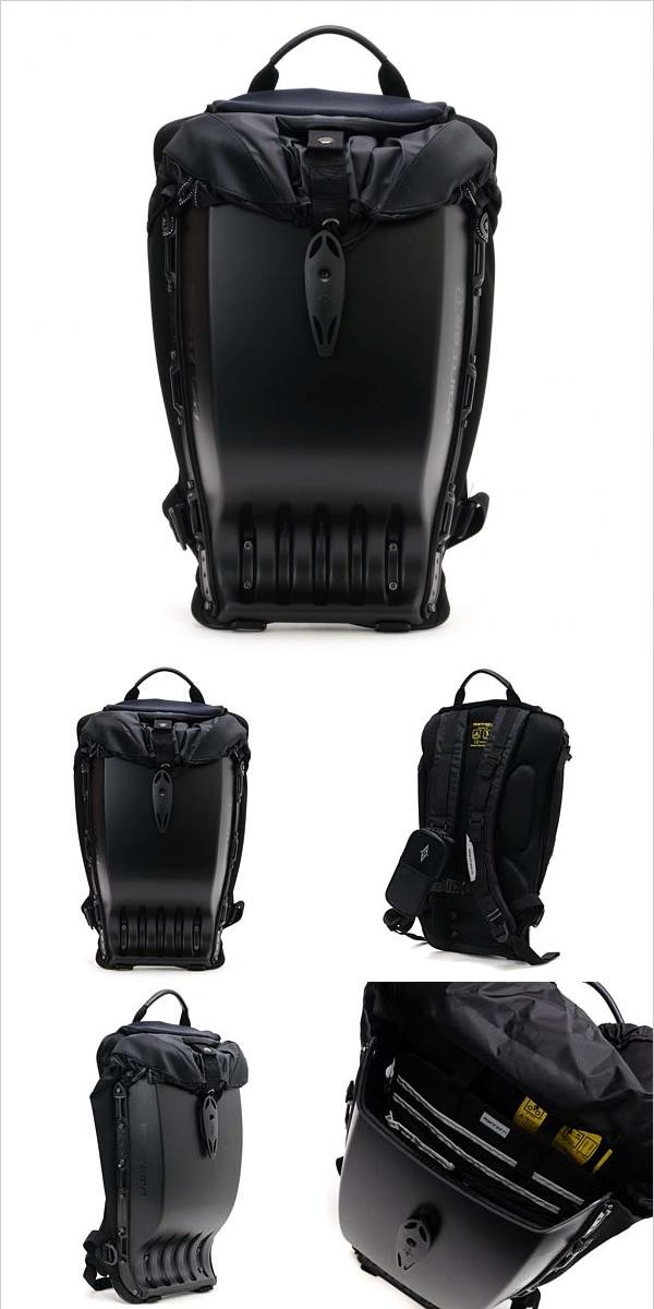 ABS樹脂製モノコックハードシェルと、ソフトなハーネス部分からなり、堅牢さとフィット感を兼ね備えたバッグになっています。見た目もとてもハードな仕上がりですが、ABS樹脂製モノコックハードシェルは収納物を外部からの衝撃から護るとても頼もしい存在です。また、モノコックハードシェル構造ならではの「S字型デザイン」により、バッグを背負った時に背中にかかる負荷を上部と下部に分散しストレスを軽減する仕組みになっています。