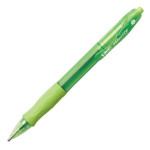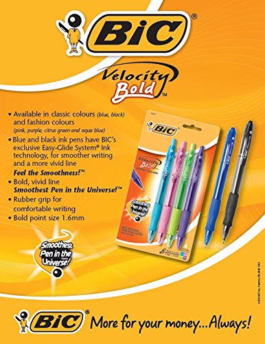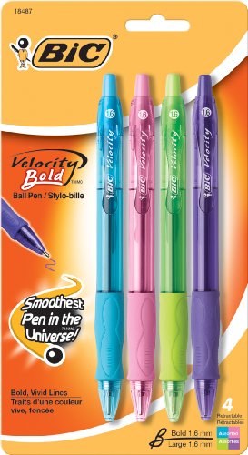 BIC Velocity Bold has a 1.6 mm bold point and Easy-Glide Ink System to create a smooth writing experience. This pen writes in bold, vivid lines and has a rubber grip for comfortable writing. Pens come in assorted, fashion inks.