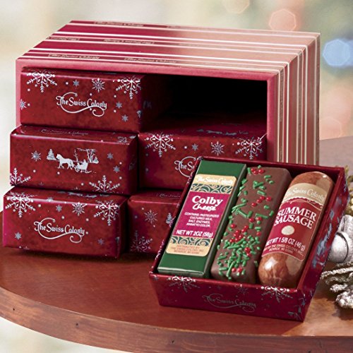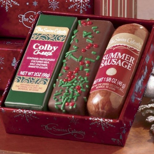 -. Binding : Misc. -. Brand : The Swiss Colony -. Feature : This item can NOT go to APO/FPO addresses / Six individually wrapped boxes make terrific handout gifts for coworkers and friends. / Each includes a snack-sized Colby Cheese, Chocolate Torte and Summer Sausage. / 1-lb. 13 1/4-oz. net wt. -. Label : The Swiss Colony -. Manufacturer : The Swiss Colony -. MPN : AA002752 -. PackageQuantity : 1 -. PartNumber : AA002752 -. ProductGroup : Grocery -. ProductTypeName : GROCERY -. Publisher : The Swiss Colony -. Studio : The Swiss Colony -. Title : Cheese, Sausage & Torte Gift Samplers from The Swiss Colony