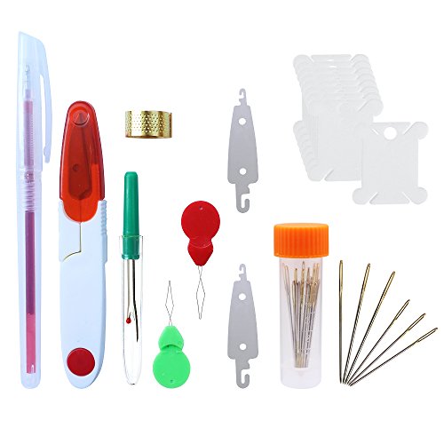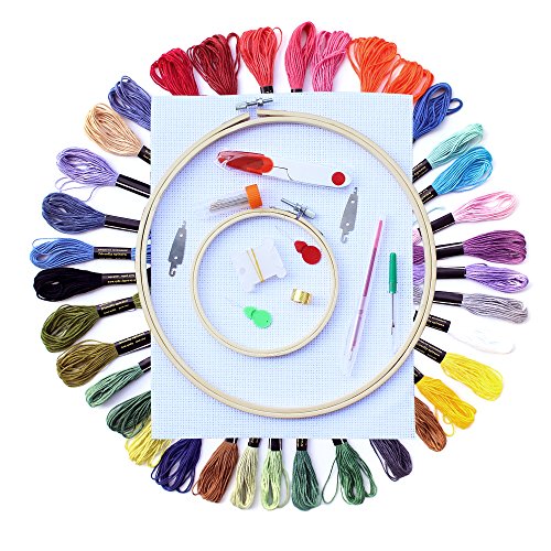 - PACKAGE INCLUDES - 1pc 30 x 40cm cross stitch cloth, 2 different sizes bamboo embroidery hoop, 36 color threads, 1pc fabric marker pen, 30pcs 3 sizes embroidery needles, 1 pair of scissors, 1pc thimble, 1pc untwist tool, 10pcs floss bobbins,2pcs needle threaders,2pcs stainless steel needle threaders and instructions