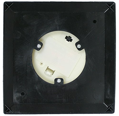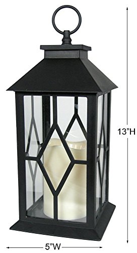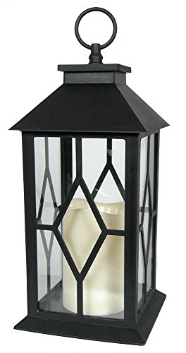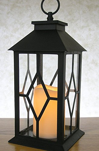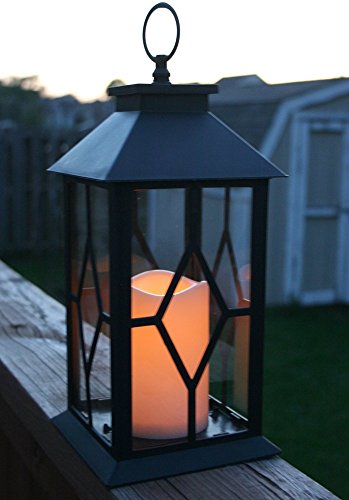 LANTERN. Beautiful black plastic lantern with glass panels already assembled. Warm white flickering flameless candle included. ON/OFF switch and timer function included on the LED candle. Weatherproof lantern makes this the perfect accent outside on a patio, deck, in a garden, line a pathway, up and down a stairway, hanging from a tree, on a tabletop, in a bookcase, on top of kitchen cabinets or on a front porch entry way.