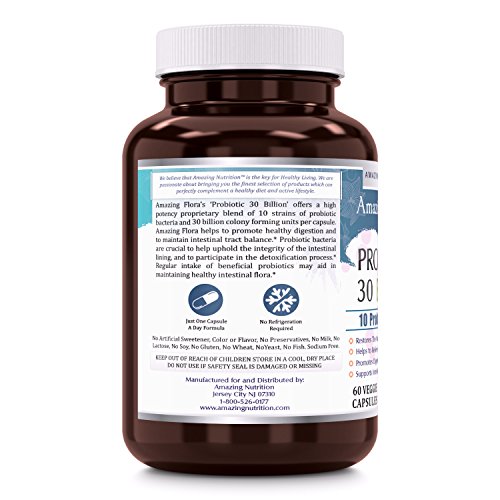 -. Binding : Health and Beauty -. Brand : Amazing Nutrition -. EAN : 0810180024112 -. Feature : MORE THAN JUST AN ACIDOPHILUS PROBIOTIC With Amazing Flora probiotic supplement you get more than just the probiotic acidophilus! Our capsules feature 30 billion probiotics from 10 different strains that have been proven to promote digestive balance / THE CONVENIENT PROBIOTICS SUPPLEMENT Our supplement provides the best probiotics at an optimal dose with just one capsule! The product doesn't require refrigeration making it easier to take on the go / IDEAL FOR THOSE WITH DIETARY CONCERNS Our probiotics capsules are a dairy free probiotic! Plus, our formula is free of soy, gluten, wheat, yeast, fish and sodium / AMAZING FLORA PROBIOTICS BENEFITS Whether you're looking for probiotics for healthy weight management or probiotics for women and men to promote healthy digestion and immune system function, you can count on AMAZING FLORA supplements to be the best. / QUALITY PURITY POTENCY All Amazing Flora products are made in USA at a GMP certified facility under strice quality guidelines. All are products are Third Party tested to ensutre purity and potency. -. IsAdultProduct : 0 -. Label : Amazing Nutrition - Amazing Flora -. Manufacturer : Amazing Nutrition - Amazing Flora -. ProductGroup : Health and Beauty -. ProductTypeName : HEALTH_PERSONAL_CARE -. Publisher : Amazing Nutrition - Amazing Flora -. Studio : Amazing Nutrition - Amazing Flora -. Title : Amazing Flora Probiotic 30 Billion With 10 Best Probiotics Strains Including Acidophilus, plantarum, rhamnosus etc * Supports Digestive & Immune Health * 60 Veggie Capsules -. UPC : 810180024112