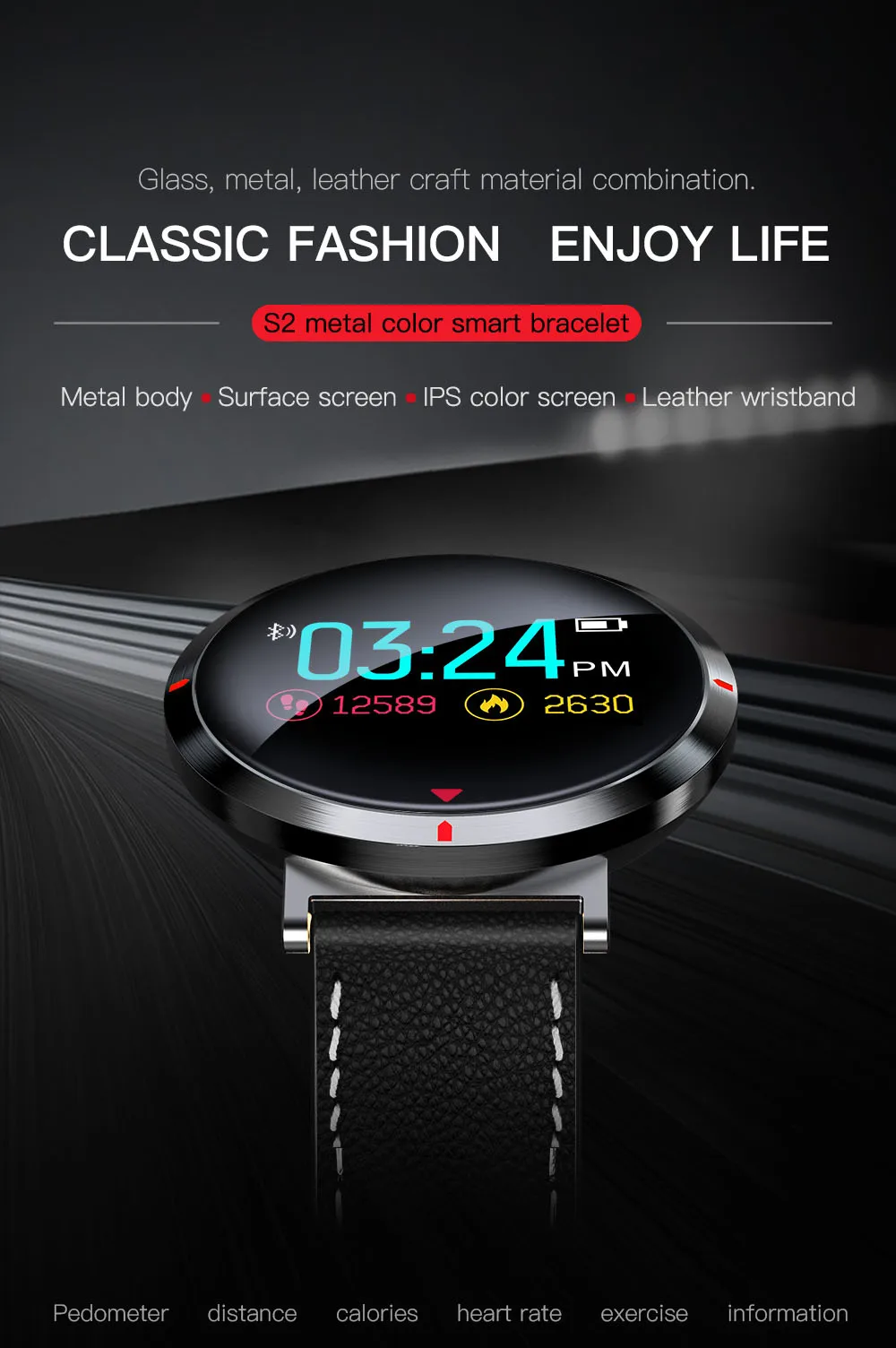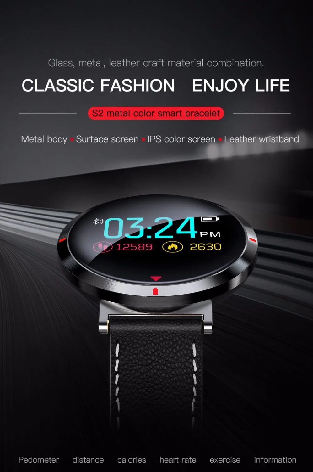 Function:Passometer,Fitness Tracker,Sleep Tracker,Message Reminder,Call Reminder,Remote Control,Alarm Clock,Permanent Calendar,Week,Heart Rate Tracker,Calendar