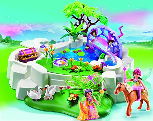 -. Feature : Enjoy a relaxing afternoon at the Magic Crystal Lake / Magical key will unlock the secret hiding place in the rocks to discover the fairy treasure / Rotating water wheel gathers water from the fountain and empties into a pool on the side / If the pool's gate is open, kids can watch as the water feeds the meadow and the flowers grow! / Includes one P.R.Incess and one fairy figure, crown, fairy wand, horse, swans, and more