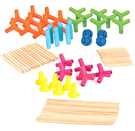 -. Feature : Innovative building with flexible connectors and wooden sticks / Build fun forms, geometric shapes, molecular models, anything / Connectors flex and bend with ease / 100% silicone rubber connectors / 76 pieces