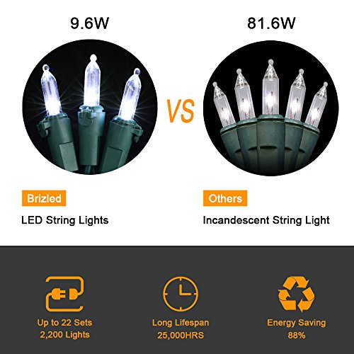- ENERGY SAVING LED STRING LIGHTS: Up to 88% energy savings over standard super bright mini lights, a set of 100 Brizled LED String lights uses only 9.6 watts replacement of 81.6 watts incandescent string lights