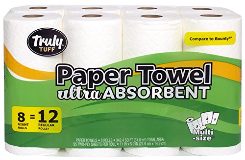 Truly Tuff Absorbent Paper Towels, Select your Size Sheets, 8 Giant Rolls = 12 Regular Rolls, White