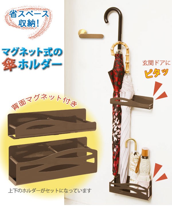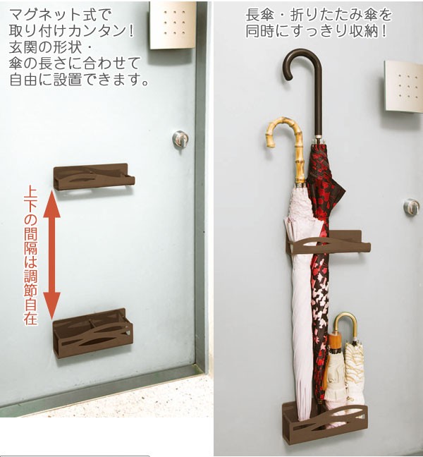 | 長傘も折りたたみ傘もまとめて省スペースに収納できるマグネット式の傘立てです。背面に付いた強力な磁石で、玄関ドアにピタッと取り付けられます。設置箇所や傘の長さ・お好みに合わせて、取り付け場所・間隔は自由自在。あまりスペースのない玄関でも、スマートにカサを収納できます。収納目安は傘4本。どんな玄関にも馴染む落ち着いたブラウンカラーです。 |