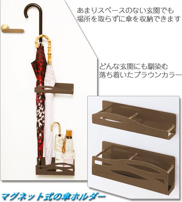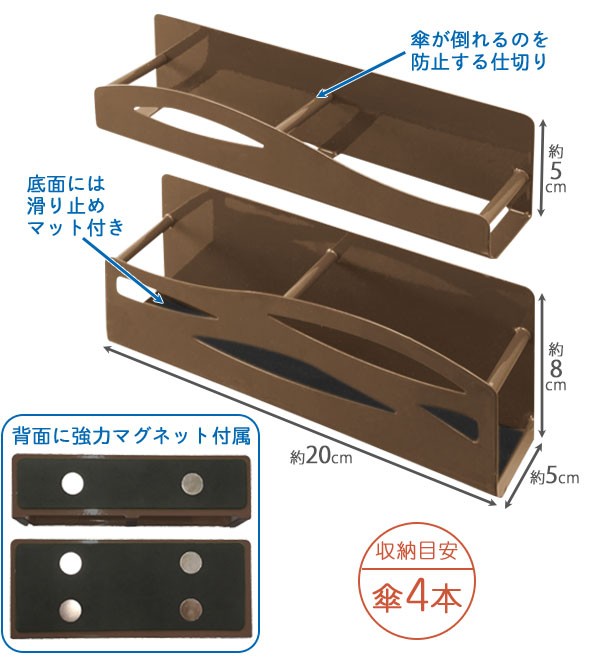| 長傘も折りたたみ傘も日傘も子ども用傘も、まとめて省スペースに収納!背面マグネットタイプで玄関ドアにピタッと取り付けられるスリムな傘立てです。底面には滑り止めマット付き。どんな玄関にも馴染む落ち着いたブラウンカラーです。収納目安・傘4本/傘ホルダー/傘入れ/かさ収納/カサ置き/傘ラック/アンブレラスタンド/マグネット式/磁石/おしゃれ/シンプル/ |