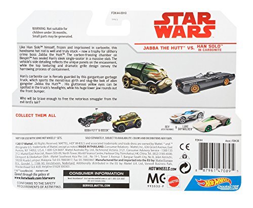 -. Binding : Toy -. Brand : Hot Wheels -. EAN : 0887961470895 -. Feature : Collect and play with a galaxy of Hot Wheels Star Wars cars / Pairs of iconic Star Wars characters reimagined as Hot Wheels cars / Authentic and highly collectible / Designed in 1:64-scale with true-to-character features and decos / Makes a great gift for fans of all ages -. IsAdultProduct : 0 -. Label : Mattel -. Manufacturer : Mattel -. Model : FDK44 -. MPN : FDK44 -. NumberOfItems : 1 -. PackageQuantity : 1 -. PartNumber : FDK44 -. ProductGroup : Toy -. ProductTypeName : TOYS_AND_GAMES -. Publisher : Mattel -. ReleaseDate : 2017-09-01 -. Studio : Mattel -. Title : Hot Wheels Star Wars Jabba the Hutt vs. Han Solo In Carbonite Vehicles -. UPC : 887961470895 -. Warranty : 1 year warranty against manufacturer defects