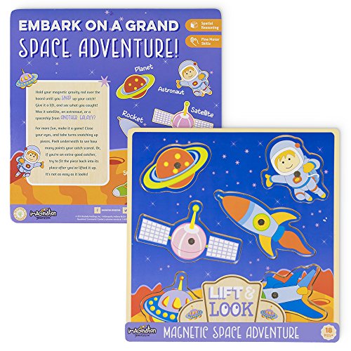 Studio : Imagination Generation Publisher : Imagination Generation Binding : Toy Product Description Hold your magnetic "Gravity Rod" over the board until you snap up your catch! Give it a lift, and see what you caught! Was it a satellite, an astronaut, or a spaceship from another galaxy? For more fun, make it a game! Close your eyes, and take turns snatching up pieces. Peek underneath to see how many points your catch scored. Or, if you're an extra-good catcher, try to fit the piece back into its place after you've lifted it up. It's not as easy as it looks! Lift Looks are a fun way to learn the names of extra-cool, extra-terrestrial space objects, practice arithmetic, and supercharge dexterity and fine motor skills. When your magnet snags some space gear, it makes an exciting SNAP as it jumps up to your wand! Better yet, two gravity rods are included with every game, so they make a great game for two. 0